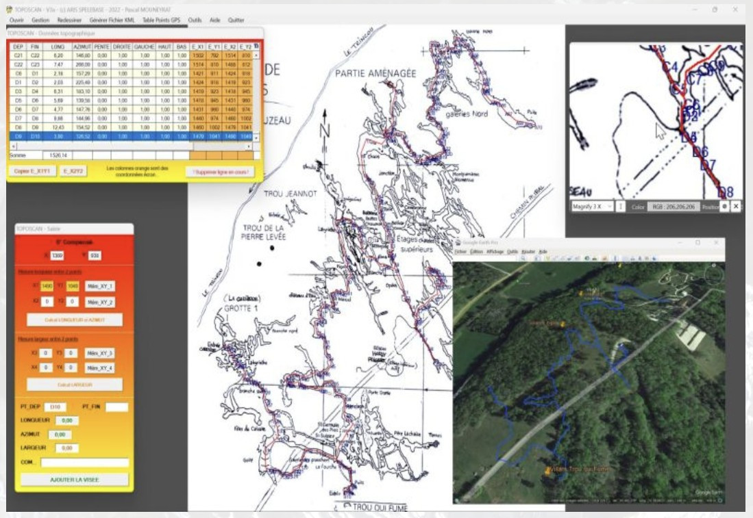 TOPOSCAN est un logiciel de topographie qui permet un export format tableur, on peut reprendre le fichier en copiant les colonnes et utiliser les fonctionnalités de par exemple Visual Topo ou autre, à partir de ses données mémorisées… Le but est principalement d'avoir un tracé en plan et de pouvoir générer un KML avec vos logiciels de topographie favoris...