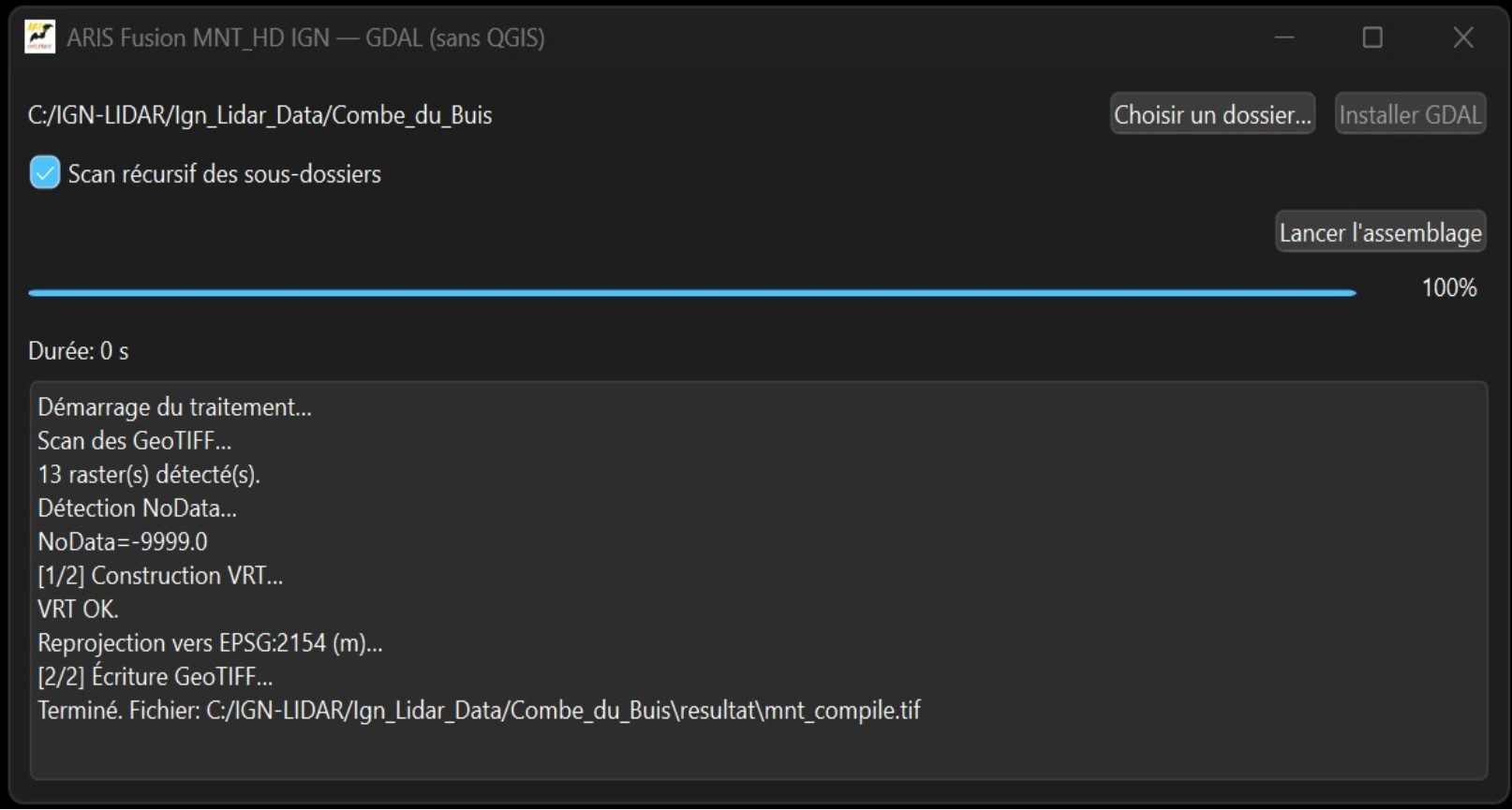 Lancer le traitement d’assemblage et il va vous créer un nouveau sous dossier « resultat » dans le projet avec un ou deux fichiers, mais surtout le « mnt_compile.tif » qui est le fichier d’assemblage des dalles.